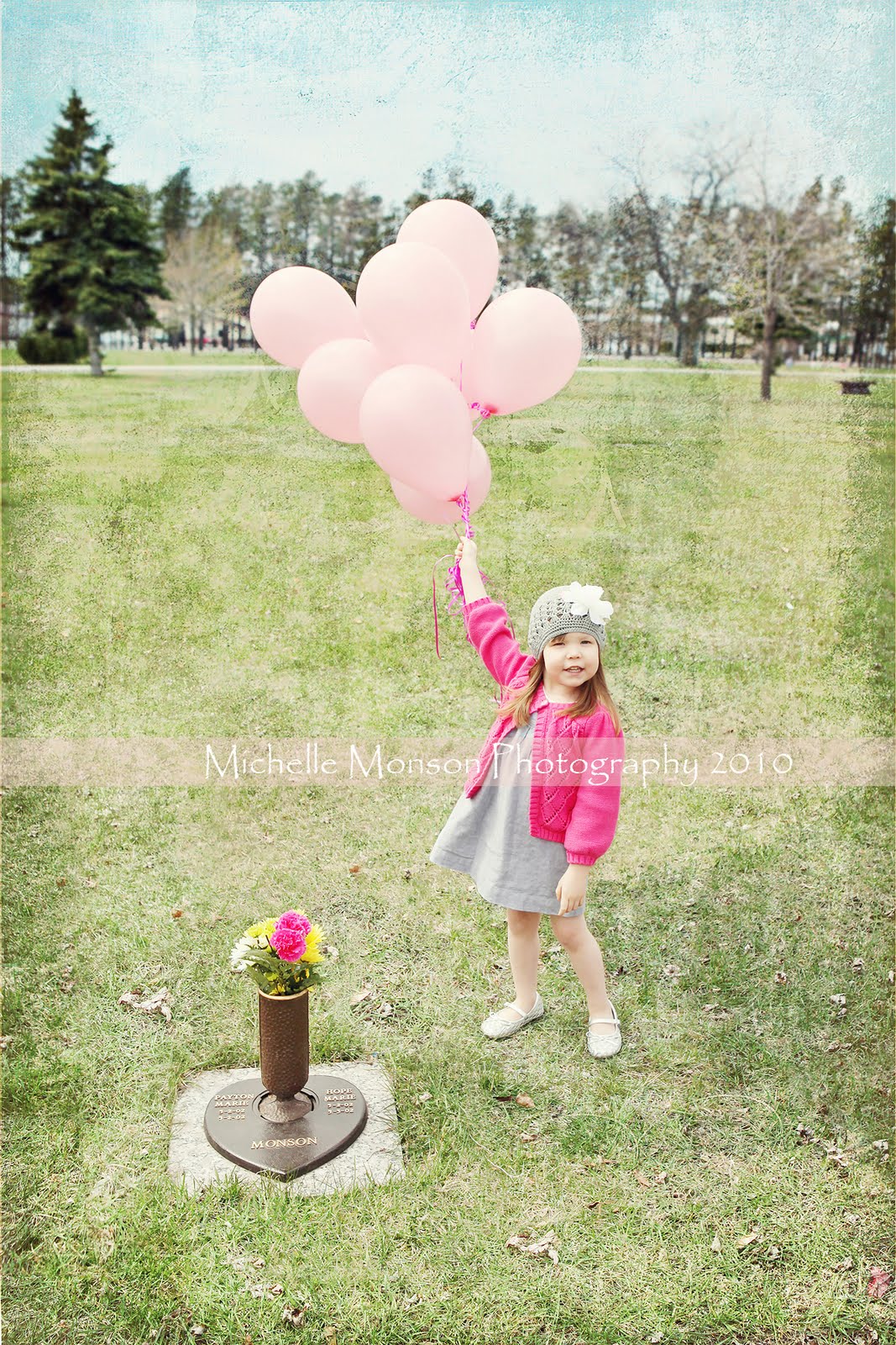 Every year for their birthday we go to the cemetery and bring the girls flowers and balloons. This year Paige is old enough to hold the balloons and be the one to let them go. Paige got a little upset though. Paige didn't want to send her sisters the balloons...Paige wanted to keep them. We finally convinced her to let them go and Paige told us that the balloons were going to the moon and not to heaven for her sisters. My husband and I of course thought that was funny...she's our little stinker!
